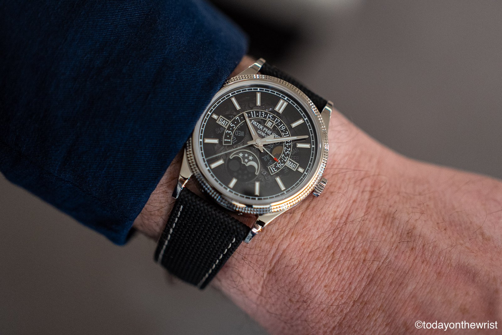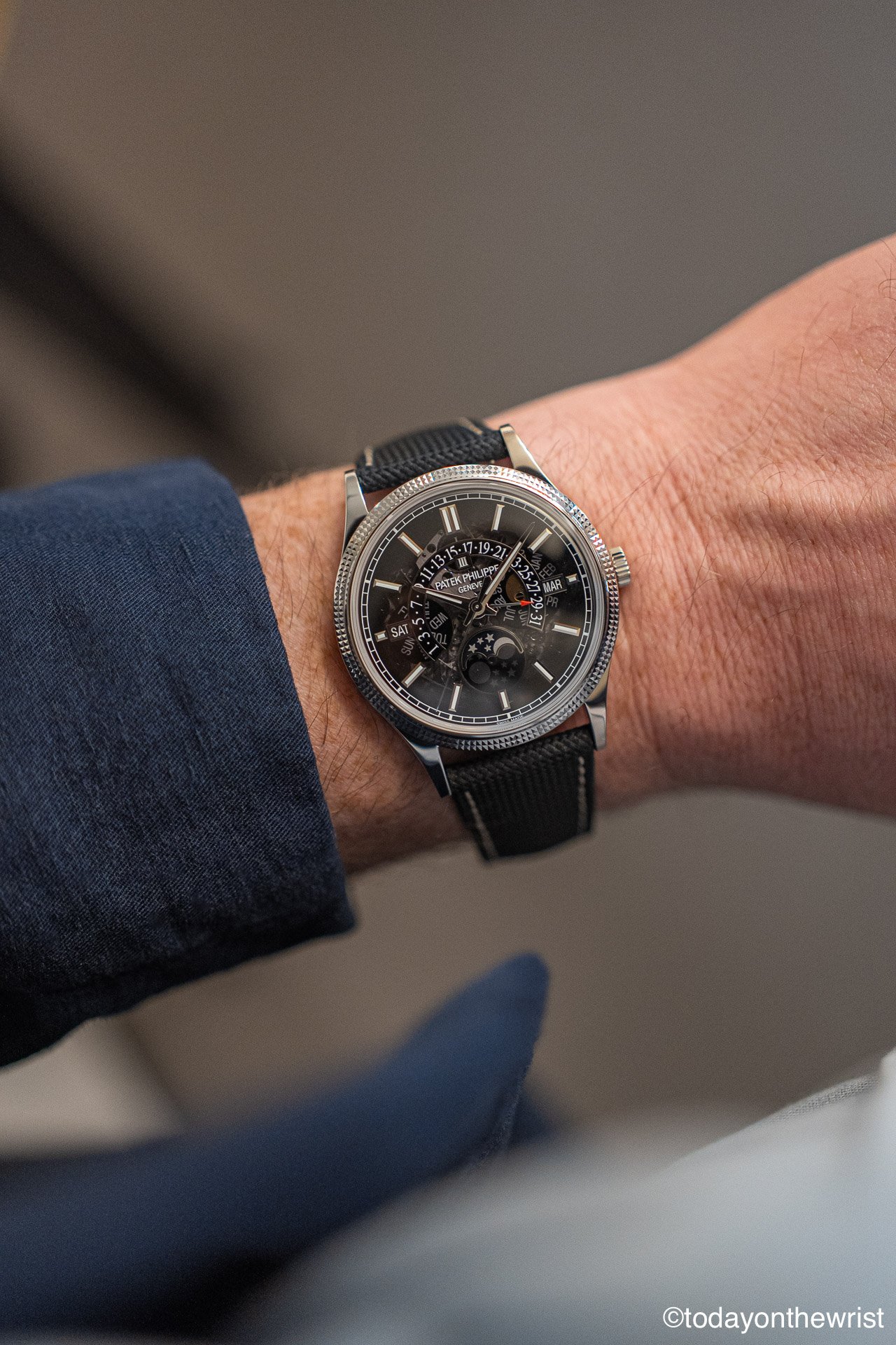 The most striking design choice is the pairing of this futuristic dial with a clous de Paris (hobnail) guilloché finish on both the bezel and the case flanks. It is a bold juxtaposition: the hobnail pattern is a staunchly “old school” Patek signature, yet when paired with the smoked sapphire, it creates a look that is firmly rooted in the 21st century.